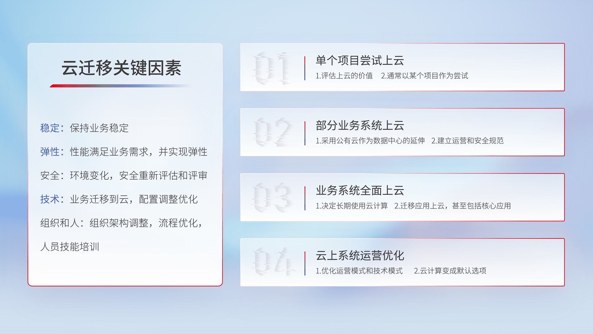 结合实际业务,,,,从规划设计、、、、云平台选型、、云原生改造、、数据迁移、、、集成交付,,,迁移全过程为客户识别最佳上云路径,,,,做好风险识别管理,,设计网络架构、、、、身份权限、、安全审计合规、、操作审计、、、日志审计、、、监控告警策略、、、、多站点容灾设计等,,对云上基础设施进行整体规划,,,提升IT治理水平,,,以满足弹性、、、、高可用、、、、高性能的需求。。。